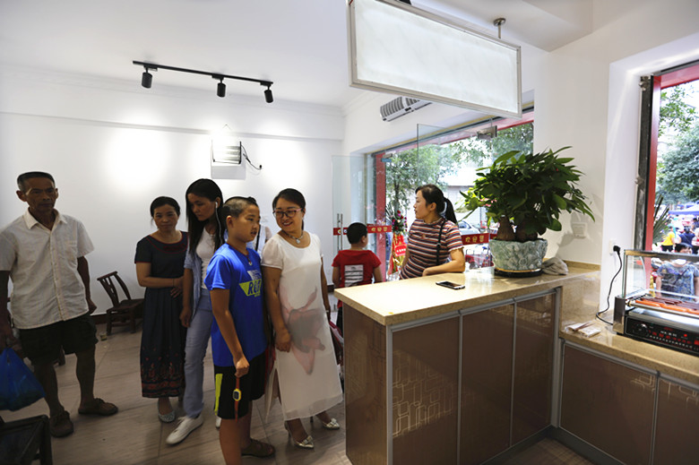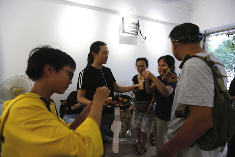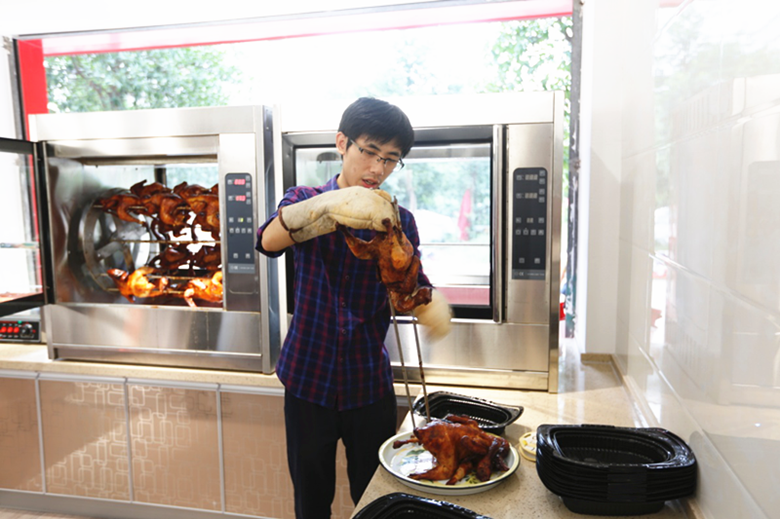 老板娘的兒子親自上陣,他說:“第一爐烤雞出爐讓我來顯顯身手。”雖然動作有點生疏,但是相信不久之后,會愈加熟練。