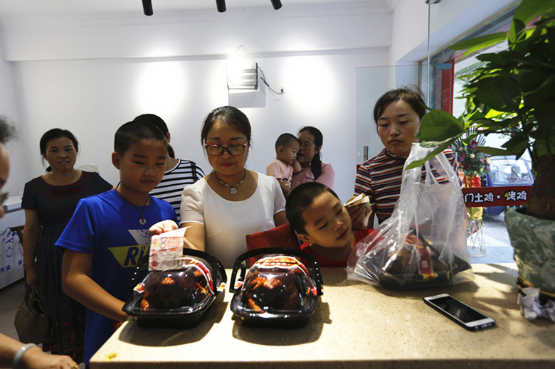 一位小朋友跟著媽媽來到店內,看到金黃金黃的烤雞,高興地說“媽媽,好香,我要大的!”媽媽說:“那就拿大的,”說完拿出百元大鈔,“我家小子老遠就聞著香味了,這開學了,買一只解解饞。”