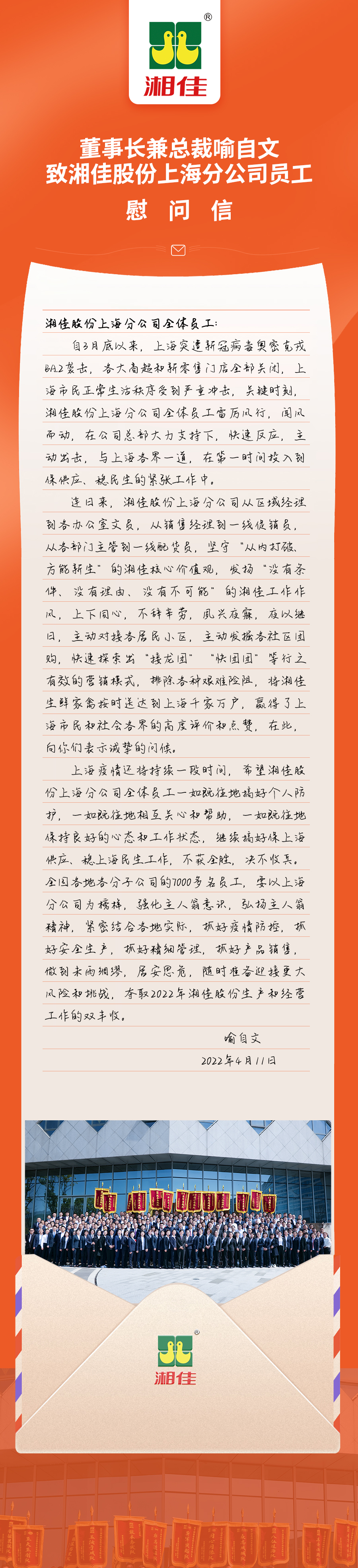 喻自文致湘佳股份上海分公司員工慰問信 發布人:文化部 發布日期:2022-04-11 5635次瀏覽 上一篇: 青春有我 筑夢湘佳|湘佳股份召開五四青年員工座談會 下一篇: 湘佳創業30周年慶祝大會:鳳領湘佳,五業齊飛