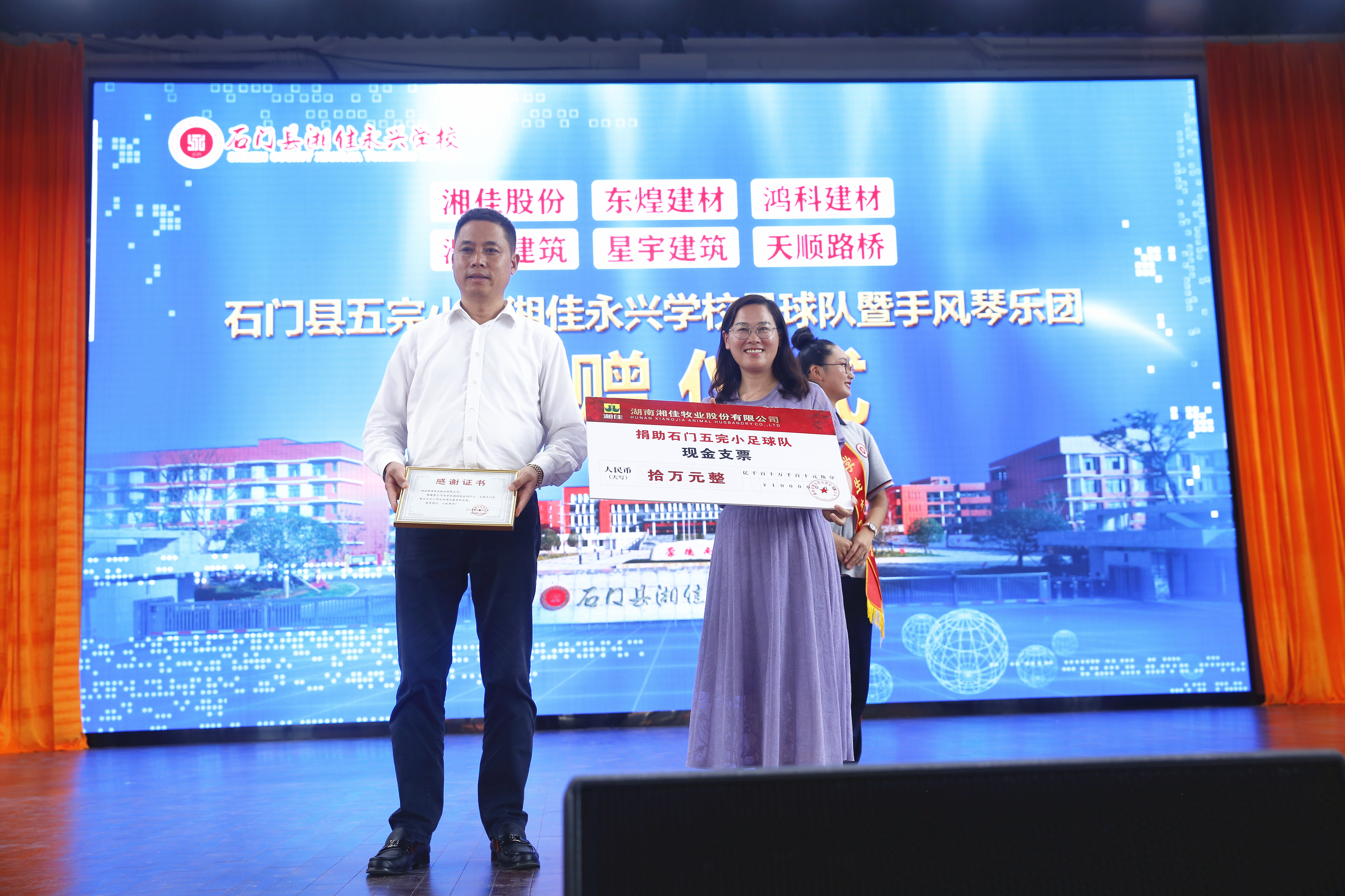 5月30日下午,湖南省石門縣五完小足球隊、湘佳永興學校手風琴樂團收到來自石門本土上市企業湘佳股份和石門本土知名企業東煌建材、鴻科建材、澧南建筑、星宇建筑、天順路橋捐贈的共計40萬元“厚禮”。